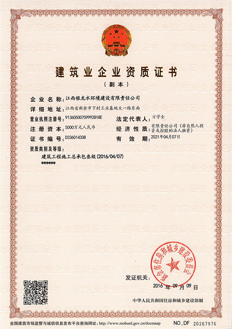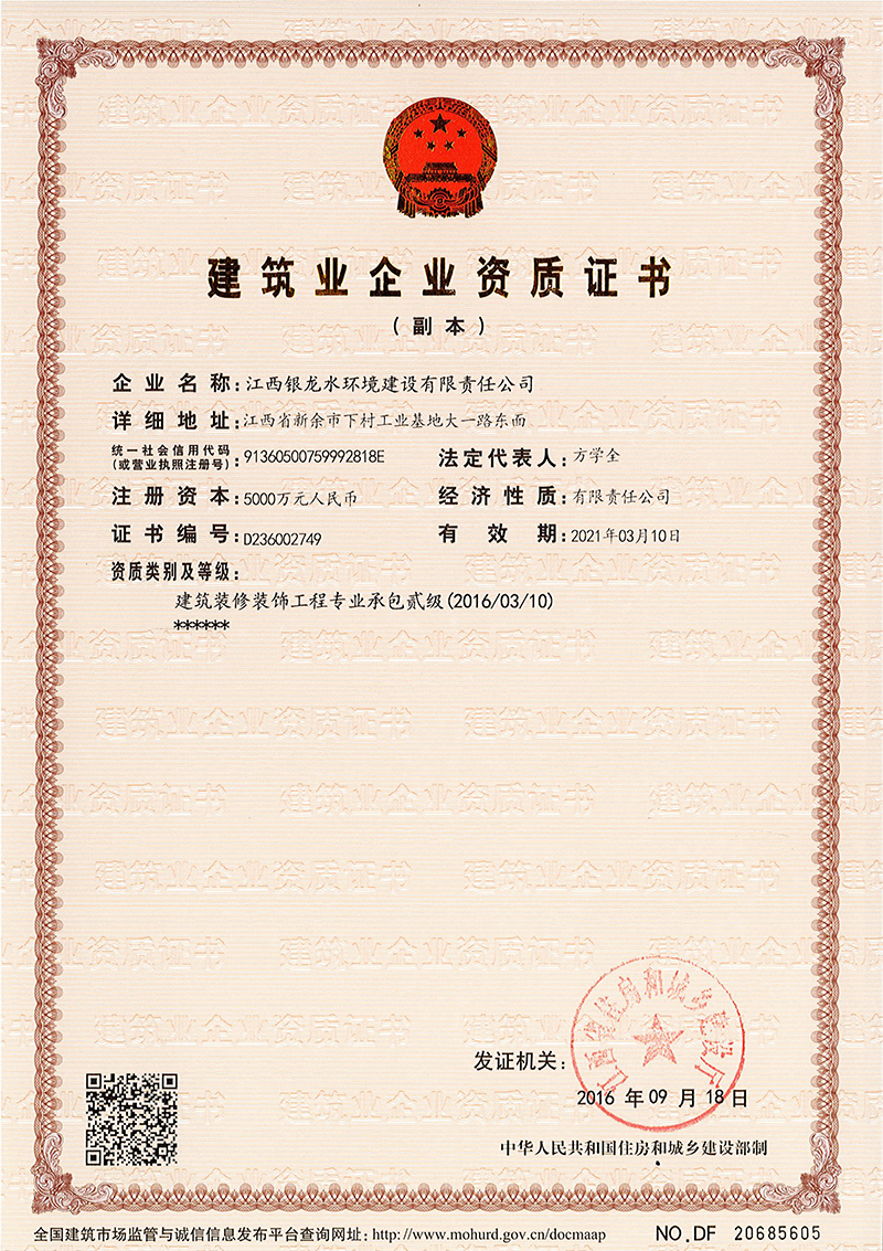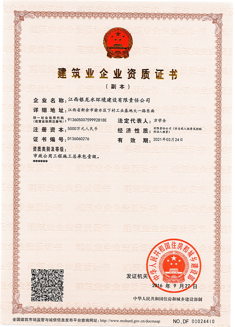江西銀龍水環(huán)境建設(shè)有限責(zé)任公司是一家具備市政公用工程施工總承包壹級(jí)、裝飾工程專業(yè)承包貳級(jí)、屋房建筑工程施工總承包叁級(jí)資質(zhì)的大型企業(yè)集團(tuán)。公司成立于2004年,注冊(cè)資金為10億元人民幣,主要從事市政工程建設(shè),市政工程設(shè)計(jì)、咨詢,水利水電工程建設(shè),土木工程建設(shè),建筑裝飾工程,綠化工程,工程設(shè)備及材料銷售和水污染治理等業(yè)務(wù)。公司于2017年通過了ISO國(guó)際質(zhì)量、環(huán)境、職業(yè)健康與安全三個(gè)體系認(rèn)證。