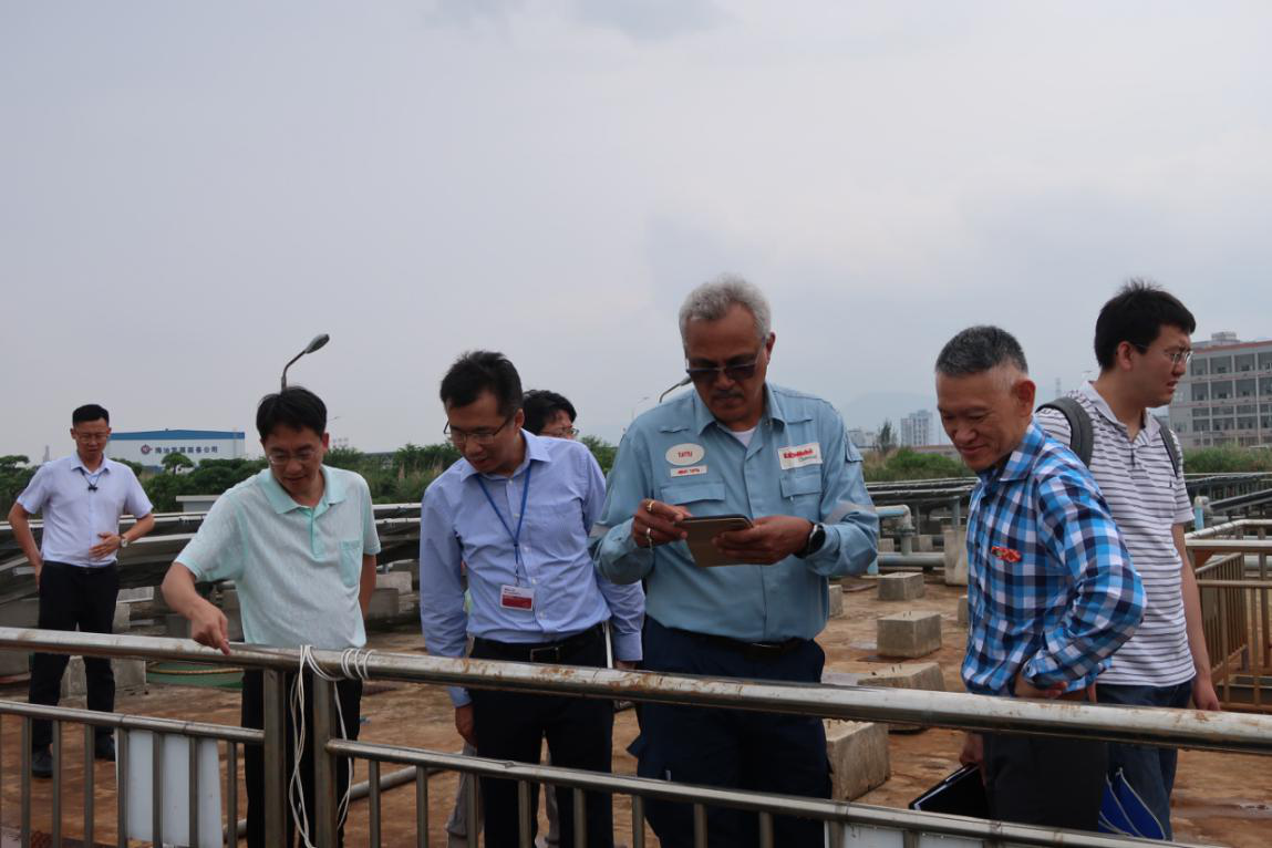 5月21日,??松梨诠炯夹g(shù)總監(jiān)潘家發(fā)、馮力潛、譚安斐等蒞臨清源環(huán)保參觀考察,金達(dá)環(huán)境董事長王小沁、清源環(huán)保董事長蔡琴、總經(jīng)理?xiàng)钤迫膛阃瑓⒂^。潘家發(fā)一行首先在會(huì)議室聽取了公司基本情況介紹,并進(jìn)行了深入的座談交流。隨后,視察了廠區(qū)的在線監(jiān)控系統(tǒng)、化驗(yàn)分析中心、綜合污水處理系統(tǒng)以及含鹽污水處理系統(tǒng),并了解公司的生產(chǎn)和經(jīng)營情況,雙方就埃克森美孚公司污水對接技術(shù)方案進(jìn)行了深入的交流。