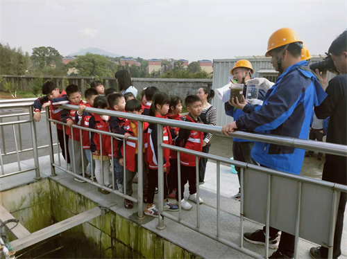 在參觀生物處理池(氧化溝)時,講解員從池中提取污水給小朋友參觀,不少小朋友好奇問到“水為什么這么臟?” 講解員解答到:“生活用水、工業(yè)用水會使清水受到污染,而污水排放又會使江河湖泊里的水受污染變臟,人們接觸或者喝臟水,就很可能生病甚至中毒、死亡”。走到進出水口時,講解員又現(xiàn)場提取進廠水、出廠水向小朋友們進行對比展示,小朋友們直觀看到了污水處理的效果,連說“太神奇”。